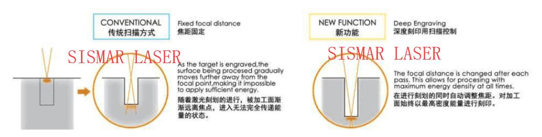 Traditional 2D marking has inherent defects in deep engraving of the object surface. As the laser focus moves up during the engraving process, the laser energy acting on the actual surface of the object will drop sharply, which seriously affects the effect and efficiency of deep engraving.