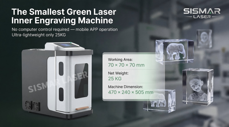 Máquina compacta de grabado láser interno 3D para cristal con láser verde de 532 nm, diseñada para un grabado subsuperficial de alta precisión. Diseño portátil de 25 kg, compatible con archivos 2D/2.5D/3D y control mediante aplicación móvil sin necesidad de ordenador.